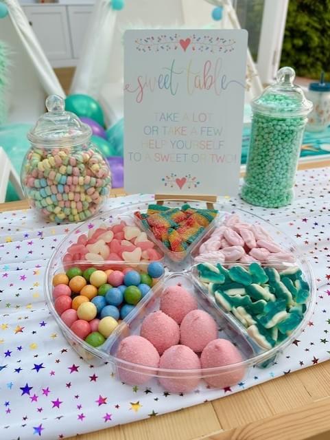 Our Sweet Table can be hired for any occasion, and would make a beautiful addition to any party. Whether it's showcasing the Sweet Jars, Popcorn Cones, Sweet Cones, Sweet Platters, Cupcakes or even the Birthday Cake, the table is a fun accompaniment to any sleepover.